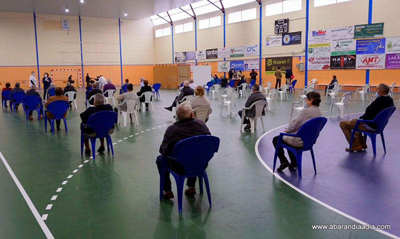 Sin ningún tipo de incidente digno de mención -más allá de un leve mareo (no relacionado con la vacuna) sufrido por un hombre que de inmediato ha sido asistido por los servicios sanitarios-, se ha desarrollado este jueves la primera jornada de vacunaciones masivas en el Polideportivo Municipal de Abarán, donde 389 personas de entre 75 y 79 años han recibido hoy la primera dosis de la fórmula de la farmacéutica Pfizer.