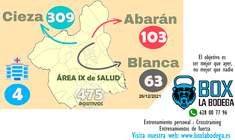 Con Cieza, que suma hoy 22 nuevos casos, Abarán ocho, y Blanca otros ocho, el número de positivos por Covid-19 en el Área IX de Salud alcanza en las primeras horas de este domingo los 475, una cifra que, afortunadamente, no se traduce en un aumento exponencial en el número de personas hospitalizadas en la planta covid del 'Lorenzo Guirao', que sigue con solo cuatro pacientes.