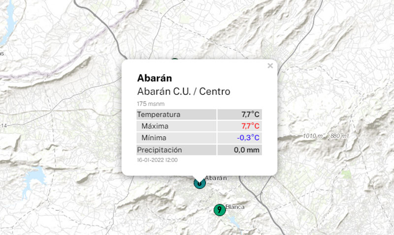 Con temperaturas por debajo de un grado -0,3ºC a las 8:00 horas y 0,7ºC a las 7:39 horas-, según los datos recogidos en los dos observatorios meteorológicos instalados en el término municipal de Abarán (uno de ellos en la azotea del edificio CIMA, y el otro en una casa de campo en el paraje de 'El Rulete'), arrancaban las primeras horas de este domingo, 16 de enero, con unos registros que se sitúan como los más bajos en lo que llevamos de invierno de 2022, «aunque es muy posible que atendiendo a las termografías, la temperatura haya podido descender más en otros lugares de huerta en territorio abaranero, especialmente en zonas de hondonada», apuntan fuentes consultadas.