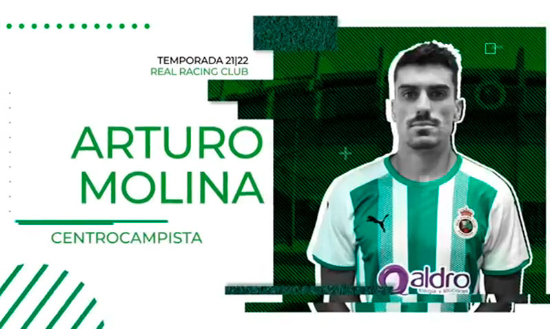 El Real Racing Club de Santander ha incorporado a su plantilla -en el presente mercado invernal- a Arturo Molina. El futbolista, que ha militado la primera parte del curso 2021/22 en el Club de Fútbol Fuenlabrada (con el que disputó 12 partidos de LaLiga SmartBank y dos de la Copa del Rey), ha rubricado un contrato que le ligará a la entidad verdiblanca hasta el 30 de junio de este año y realizará, en la jornada de hoy, su primer entrenamiento en las Instalaciones Nando Yosu.