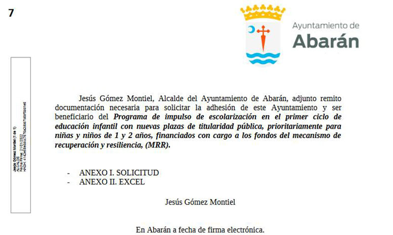 14 de enero de 2022 «Recibimos por el sistema SIR (interconexión de registros) "SOLICITUD DE PROGRAMA DE IMPULSO DE ESCOLARIZACIÓN DE 0 A 3 AÑOS CON CARGO A LOS FONDOS MRR" documentación para adherirnos a este plan. Este documento, hasta que no se asigna a un grupo dentro del programa de gestión del Ayuntamiento, no se da oficialmente por recepcionado».