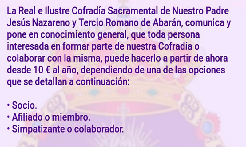 La Real e Ilustre Cofradía Sacramental de Nuestro Padre Jesús Nazareno y Tercio Romano de Abarán, comunica y pone en conocimiento general, que toda persona interesada en formar parte de nuestra Cofradía o colaborar con la misma, puede hacerlo a partir de ahora desde 10 € al año, dependiendo de una de las opciones que se detallan a continuación: