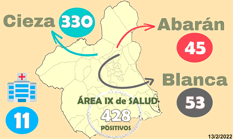 Los datos actualizados a fecha 8 de febrero -en lo que al Área IX de Salud se refiere-, nos dejan un nuevo descenso en el conjunto de la comarca pero una notable subida en el número de personas ingresadas en la planta covid del Hospital de Cieza, que casi duplica su número con respecto a ayer al pasar de 7 a 13, si bien en el momento de redactar esta información dos de esas personas estaban pendientes de los resultados de PCR. Los nuevos pacientes son vecinos de Cieza y Abarán.