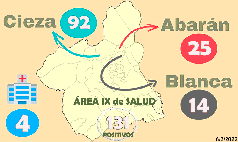 Con un ritmo lento pero continuo, la cifra de personas afectadas por la Covid-19 en nuestra comarca continúa en un moderado descenso intersemanal y reduce en 42 el número de positivos con respecto a los últimos siete días. Así las cosas, hoy domingo, 6 de marzo, el Área IX de Salud contabiliza 131 positivos y, un nuevo ingreso en las últimas horas coloca con cuatro pacientes a la planta covid del Hospital de Cieza.